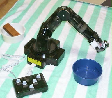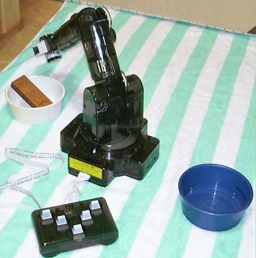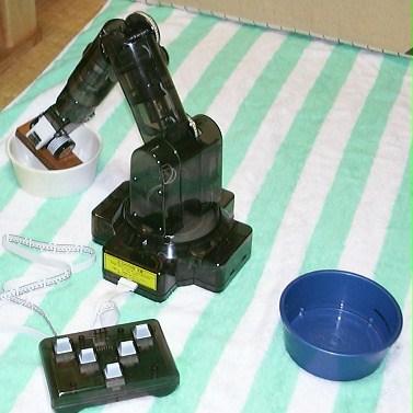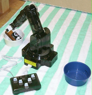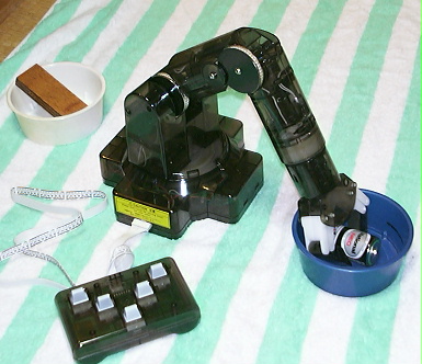 | 昔、エレキットという名前でキットを出していた福岡の会社がありましたが、そこのキット部門が独立してイーケイジャパンとなったように記憶しています。 この会社は、オーディオ関連のキット( 真空管アンプ等 )出しており知っていましたが、ロボットアームのオモチャも販売し始めました。 前々から、これに興味をもちどのような物だろうと思っていましたが、偶然最近手に入れることが出来ました。 大雑把にいえば昔のプラモで組立てた事のあるリモコン戦車のロボットアーム版と思えば当たっています。 これは、ロボットアームのメカの構造を理解するには非常に良い教材ではないかと思われます。 結構、遊べます。 但し、アームの制御はオープン制御でセンサ等が全く無いのでパソコンで自動制御しようとすると動かす事は可能ですが、反復動作の位置精度等を期待するのは無理です。 持ち上げられるのは、単一乾電池 一個が 限度です。 このロボットアームには5つの関節があり、モーターで正転、逆転が可能です。 リモコンユニットの5つのレバーで制御します。 単一乾電池を掴ませ移動するところを、順番に写真にとって見ました。 どのような動きが出来るかは おおよそわかると思います。 ( 型式 MR-999 価格は 5,500円です。 ) |