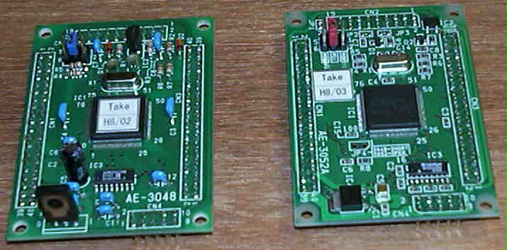 | 上の写真 左が、H8/3048の基板、 右が H8/3052の基板です。 ちなみに、2つのCPUの大まかな違いですが H8/3048 H8/3052 ---------------------------------------------- ROM容量: 128Kbyte 512Kbyte RAM容量: 4Kbyte 8Kbyte CPUクロック周波数: 16MHz 25MHz 書き込み電圧: +12[V] +5[V] CPU動作モードに若干違いがあります。 RAM容量が増えた分、RAMの開始アドレスが、4Kbyte分 若いアドレスにずれてます。 3052対応のための改造詳細 |