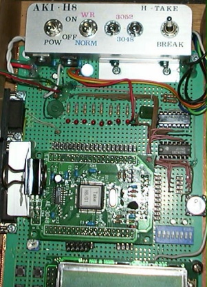 | 以前のものと比べると上部放熱板を兼ねたパネルのスイッチが増えました。 パネルは作り直しとなりました。 このパネルに3端子レギュレータを 2個付けています。 スイッチは左から、電源SW、書込み/通常SW、次の2つの小さいスイッチが、2個組にして3048と 3052の書き込みの電圧と結線の切り換えです。 一番右が、ブレークSW ( CPUに NMIを 出します ) モニターデバッガにて使用します。 秋月のモニターデバッガの資料では、H8の NMI端子をいきなりSWにてグランドに落とすように書いてあります。 それを行うと、SWのチャタリングで、NMI割り込みが多重に入ったようになり好ましくありませんので、外付けのTTLで構成した RS-FFにてスイッチのチャタリングを取り除いています。 右側に2個 TTL ICが乗ってますが、RS-FFと LEDのドライバを構成しています。 真中より少し上に、横に8つ発光ダイオードと電流制限抵抗が並んでいます。 8本の抵抗の左にある、緑色の丸いのが半固定抵抗器です。 CPU基板のレギュレータには、クリップで挟みつける形の小さいアルミの放熱板を付けています。 |