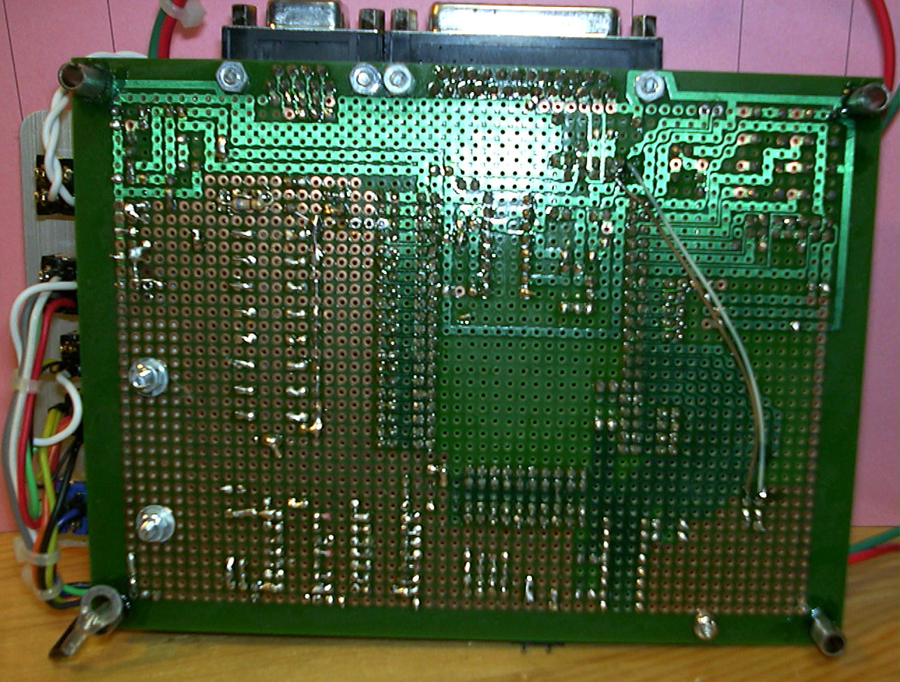 アルミのアタッシュケース内は こんな感じです。 RS-232Cのケーブルがちょっと じゃまな感じです。 ちなみに、電源のケースと CPU基板を入れてるケースは 台所用品の食品を入れるプラスチックケースです。 よって、やや ふにゃふにゃしてます。 ある方の要望により、マザーボードの裏面(ついでに 表面も)拡大した画像をUpしておきます。 <マザーボード表面拡大> <マザーボード裏面拡大> ★ 拡大画像から戻るときはブラウザの 戻るボタンを押して下さい。 (^^; |