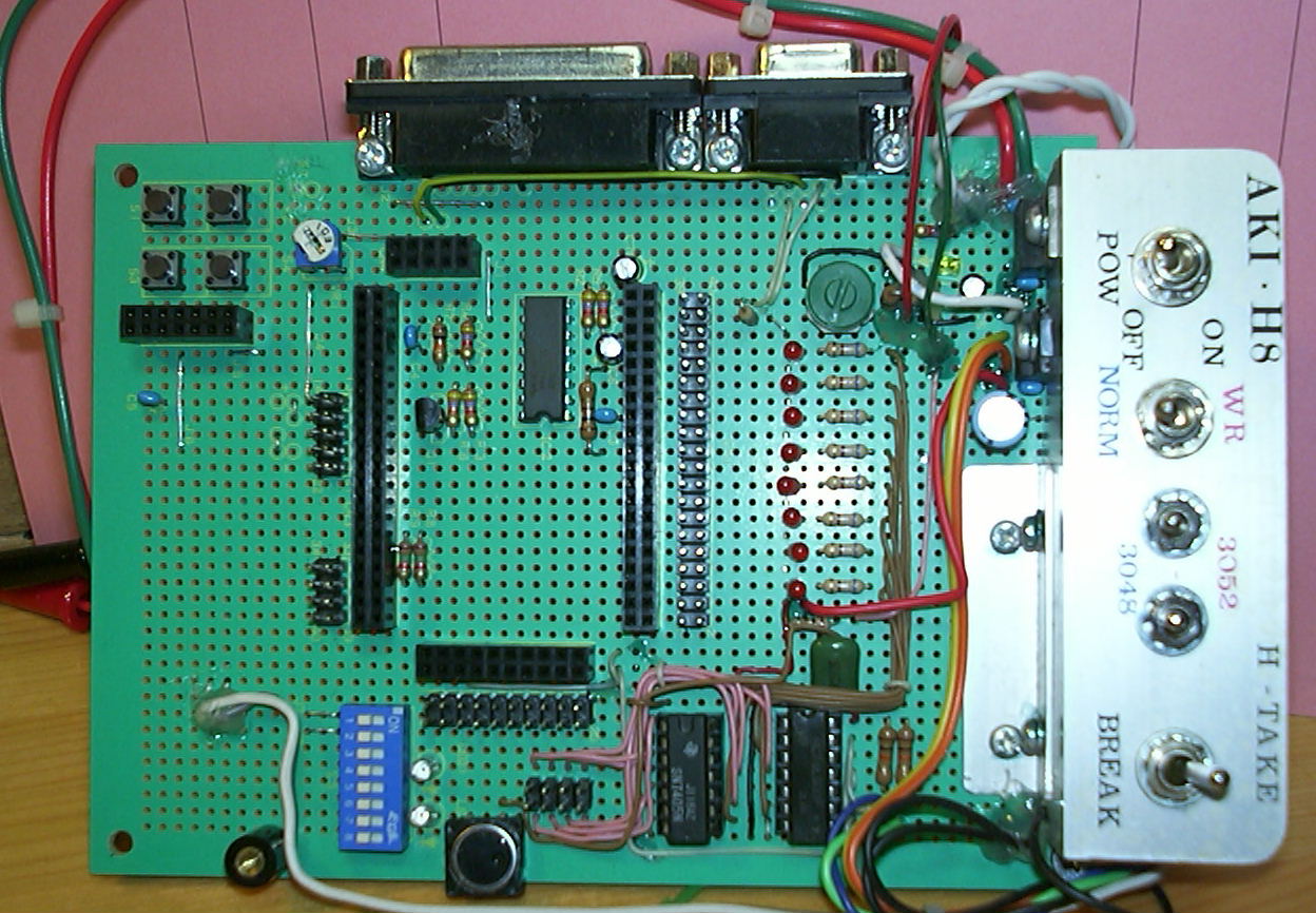 | 改造そのものは、かなり以前に行いました。 改造の最大の理由は、AE-3048( H8/3048)と、AE-3052A( H8/3052)の 両方のプログラムの書き込みに対応させるためです。 最初、マザー購入時は AE-3048しか扱っていませんでしたが、その後、AE-3052Aを使うようになり、マザーボードを両方のCPUに 対応出来るようにしたかったのです。 AE-3048と AE-3052は ROMと RAMの容量が増えた(それとクロックが早くなった)以外は、ハード、ソフトともに互換性が高く、ソフトではRAMの開始アドレスと、クロックの周波数に依存する処理(タイマーとRS-232Cのボーレイト)さえ気をつければソフトコンパチといえます。 ハード的にも、AE-3048、AE-3052の 2枚の基板はピンコンパチになっています。 ただ一つ異なるのは、プログラム書き込み時の電圧です。 H8/3048は、+12[V]でしたが、 H8/3052は 5[V]です。 また、書き込みに関わる信号線の配線が若干異なります。 よって、この2つのCPU基板の 両方のプログラム書き込みに対応する事が最初の課題でした。 ついでに、デバッグ用に発光ダイオード8個、半固定抵抗器( A/Dコンバータ入力用 )をマザーボード上に追加しました。 見た目は、ちょっと狭苦しい感じになりました。 あと、発光ダイオード8個を、CPU基板の 5[V]レギュレータから取ると、点灯時やや電流を流すので発熱が気になりました。 よって、外付け回路用に別途 5[V]レギュレータを追加しました。 |