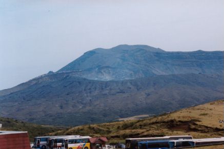 | 草千里から写した中岳です。 写真では 分かり難いのですが 煙が出ているのが 分かりますか。? |