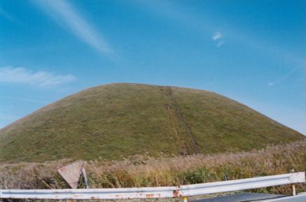 | 草千里手前で写した米塚です。 頂上が窪んでいます。 伝説では 阿蘇創造の神 健磐龍命(タケイワタツミノミコト)が 収穫した米を積み上げた山といわれています。 山頂の窪みは 貧しい旅人に米を ひとすくい与えたために出来たといわれてます。 |
