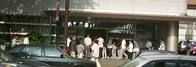 | 私が、このようテーマの文章を書くのは不似合いな気もするが、世の中的にも深刻な問題であり、私自身も現在失業者であるからだ。( 2002年 時点の話です。) いつからが不況かというと、人により解釈が異なるであろうが私は 90年半ばからと考える。 90年代前半、電子工業分野では、日米半導体摩擦のため、産業界の米といわれる ICのうちもっとも世の中に普及しているDIPタイプ(特に中小企業が使う)の ICを日本のメーカーは製造しない事になった。 当然、その後日本では DIP ICは不足するわけで、それを補う形で海外から ICが入ってきたかというとそうではない。 特にパソコン周辺機器を作っている中小企業は、材料を入手できずに、もろに打撃を受けた。 そして94年ごろから、海外製の安いDOS/Vパソコンが、日本に流れ込むようになってきた。 日本のパソコン関連メーカーは泣きっ面にハチというところではなかっただろうか。? これは、一つにはパソコン業界は時代の変わり目にさしかかっていたといえる。 今までの DOSの時代にはそれぞれの日本のメーカーの特徴を出したパソコンが売られていた。 IBM-PCAT互換機以外のパソコンがこれだけ普及していたのは日本だけである。 日本のパソコンの歴史はアメリカ以外の他の国に比べ、古く 8bitの時代から国内で独自の文化を築き上げてきた。 16bitの時代になって漢字処理が本格的に普及してきた。 その当時のCPUは処理能力がそれほどなかったため、漢字フォントのROMをハード的に実装していた。 また、この漢字表示の問題もあり海外製のパソコンが日本に入ってくる事はなかった。 ところが、94年ごろIBM-PCAT機にてソフト的に漢字を表示する DOS(DOS/V)が出始めた。さらにその上で Windows3.1が走り始めた。 これにより、漢字を表示するために日本のパソコンを使わなければならないという必要がなくなった。 Windowsは 見栄えのよいGUI環境により一般の人に対する受けも良かった。 更に、95年末に Windows95が発売され、NECのPC-98以外の 日本仕様のパソコンは、消えていった。 NECも徐々にPC-98の仕様を DOS/V機に近づけていった。 で、90年代半ば以降日本のメーカーは海外製の安いDOS/Vパソコンに対抗出来ないため、自社で製造する事をやめて台湾メーカー製などをOEMで販売するようになった。 まず、これによりパソコンを製造する工場が90年代半ば過ぎに相当数(というより殆ど)、閉鎖に追い込まれたと思われる。(唯一ノートパソコンに関しては小さい物を作るのが得意な一部の日本メーカーの生き残る分野となったようである。) そして、パソコンの仕様はハードはインテル、ソフト(OS)はマイクロソフトが支配するようになる。 これにより、日本のパソコンメーカーは、製造はしないで台湾のOEM、設計開発も全てアメリカ企業の受身で独自性を全く出せない状況となった。 それと価格競走が激しくなり、利益が出にくい商品となってしまった。 今、日本は工場の海外シフトで産業構造の空洞化、そして設計開発力も、アメリカの受身になっているため危ないといわれる。 パソコン業界だけみても、このような背景があり、日本の工場がなくなり雇用の場が減少していく事になった。 他の業界でも売上あるいは、利益の減少により リストラを行う企業が増えてきた。 そして、リストラを行う事が企業が生き残るため正当な手段となってしまっている。 また、中には さほど売上が落ちてないのに、そのような時代背景を理由に便乗して人員整理を行う会社もある。 そして、いずれ景気が回復するだろうと、リストラや規模縮小等を 行わず頑張ってきた中小企業は 2000年以降、息切れしてバタバタと倒産状態にいたっている。 今の状況では、いずれにせよ失業者が増える要因が蔓延している。 下の写真は、熊本のハローワーク(職業安定所)の始業とともに、建物内に、なだれ込んでいる失業者の方々の写真です。 私はこの多さを見て最初びっくりしました。( 2002年 夏 ) 私もハローワークに通いだし3ヶ月ほど経過したころ、以前見た人を何人か見ました。 そんなに大勢覚えている訳ではないので、たまたま失業給付金の説明のとき隣の席に座った方等をを覚えていたというだけです。 また同じ顔を見るとこの人たちも次の就職がなかなか決まらないのだろうなと思いました。 特に、40歳以上になると再就職が、かなり難しくなってきます。 企業も前向きに人を雇おうというところが少ないのと、雇うなら30代前半までというような感覚でいます。 というのは、企業としては、40代以上は リストラの対象として捕らえているようです。 特にコンピュータ関連の仕事は若い人にとっては有利ですが、40代以上の技術者にとっては厳しいものがあります。 昔、プログラマーの定年は30代半ばといわれている時期がありました。 それは、次から次へと新しいテクノロジーが出てきて、昔の知識ノウハウが役に立たないようになってくるからです。 そうなると、新しい物への順応能力の高い若い人の方が