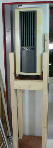 右側: 台に冷風機を乗せたところです。