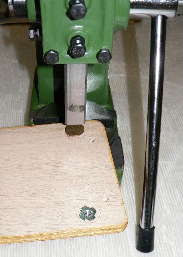 爪つきナットの上に10円玉を乗せてハンドプレスで押し込みました。