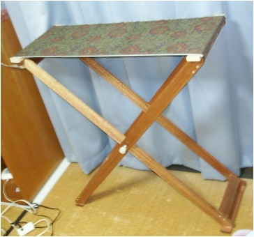 | これが広げたところです。 上に張ってある布は何とタオルなのです。 大きさ的にはちょうど良かったのですがだんだん伸びてこないかが心配です。 今のところはいいようですけど...。 ところで、このタオルを木に固定するのはタッカーというホッチキスに似た工具でホッチキスの弾と殆ど同じものを多数打ち込んで固定しています。 これは、木で出来たイスに布地を固定するのにもよく使われます。 |