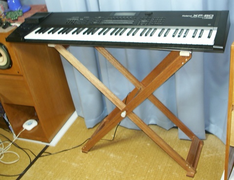 | この写真は一応完成した写真です。 いったい折りたたみ式キーボードスタンドとは何なのかというと、このスタンドそのものは上に布を張ってある折り畳みイスの足を長くしたようなものです。 で、上に乗るキーボードとは パソコンのではなく、シンセサイザー等の電子楽器のキーボードです。 たぶん、楽器を乗せるスタンドで布を張った折り畳み式のものは、まだ無いと思います。 |