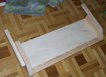 | 裏側です。 やや重くなりますが、机の延長として使うので、たわまないよう補強しています。 左右の連結棒を取りつけている台形に切断した板は2×4材です。 |