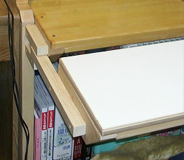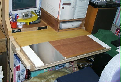 | 完全に奥まで入れ込んだ状態です。 この白い板は、横幅 86cm、奥行き 30cmあります。 パソコンデスクのスキャナ手前が、15cmなので合わせて奥行き方向に、45cmの机面が出来た事になります。 これだけ有れば、本を読んだりノードの記入作業も楽に行えます。 |