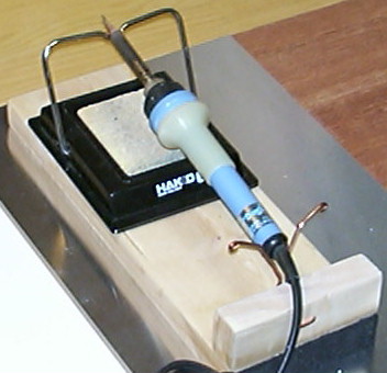 | 更に、おまけです。 半田付け作業をしている時、前から思っていたのですが、半田ゴテがコテ台から滑り落ちると危ないので、電源コードの部分で引っ掛けるコテ台の台といおうか..? まあ、左のようなものを 端材で作りました。 |