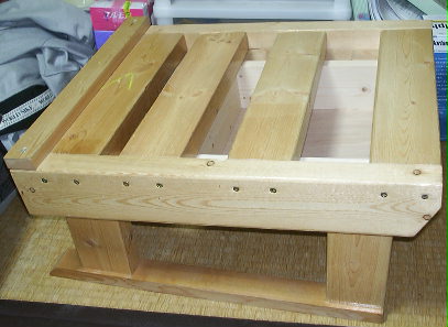 | 台を逆さにして見たところです。 奥行きは、A4の長手方向より、 少し短くしています。 股を開けはすぐに入れられるので便利です。 |