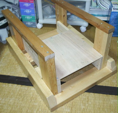 | この座椅子の台は2×4材で出来ています。 台の脚の内側に、10cm幅、21mm厚の板を コの字状に組み合わせ木ネジで固定しています。 それに、ベニア合板の底板を、これも木ネジで 固定しています。 上の隙間から引き出し状に見えているのが それです。 |
