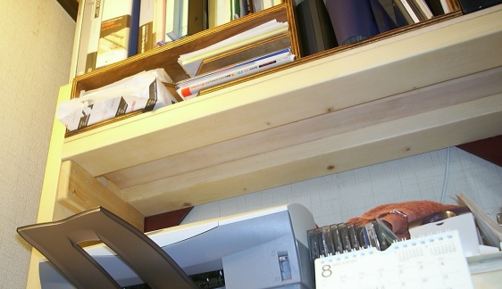 | 取付け場所ですがパソコンラック の上の棚の裏側。 2本の2×4材が前と後ろに あり棚を支えています。 この前と後ろの2×4材の隙間に 埋め込む形で作れないか。 というのが、最初の発想でした。 パソコンラックの前に座った状態 ではかなり高い位置にスピーカー がある事になります。 よって、下向きの三角屋根みたい な形のエンクロージャを作って スピーカーが斜め下を向く形で 作る事にしました。 |