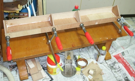 | これは、2×4材にはまり込む ベースになる部分を組み立てて いるところです。 横長のコの字型のベースに 4箇所5角形の仕切り板が 立ってます。 そしてその仕切り板の部分を 外側からクランパで締め付け を行っています。 板の継ぎ目に白く見えるのは 木工用ボンドです。 乾くまでこの状態で放置して おきます。 気象状況にもよりますが2日 ぐらい置いておけば良いと 思われます。 |
