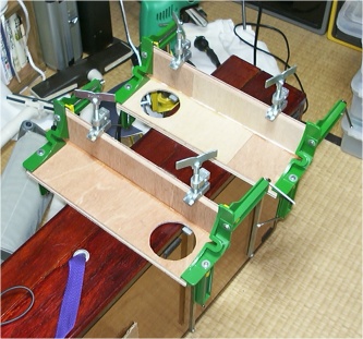| これは、上の(ラックに取付け たら下)三角屋根の部分です。 継ぎ目は、90度に合わせて 接着してます。 丸い穴は、スピーカーの取付け 穴です。 両端を緑色の工具で締め付け てますがこれは直角クランパ です。 その内側を銀色のハタガネで 締め付けています。 これも、木工用ボンドが乾く まで放置しておきます。 ちなみにその下の赤茶色の箱 は2年ほど前に作った楽器用 ケースです。 |