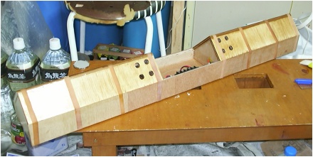 | これは、後ろ側から見た ところ。 背面の空気圧を逃がすため Left、Rightともに4つの穴を 開けています。 板の塗装は、ベースと屋根を 接合する前に行いました。 屋根のところは表から見える ので油性ニスを塗り、ベース 部分は水性ニスを塗っていま す。 油性の方がツヤは出る のですが、刷毛の手入れを 考えると水性ニスの方が 楽です。 |