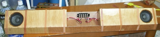 | これは三角屋根の内側に スピーカーを取付け屋根部分と ベースとを8本の幅広の輪ゴム で締め付けています。 ボンドが乾くまでこの状態で 放置します。 |